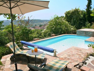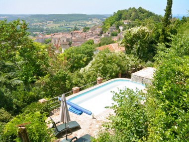 Hilltop villa with spectacular views over medieval bastide town, 5 min walk to restaurants. Heated Pool, Terraced Gardens Offering Complete Privacy.