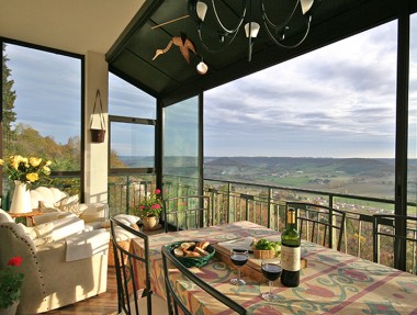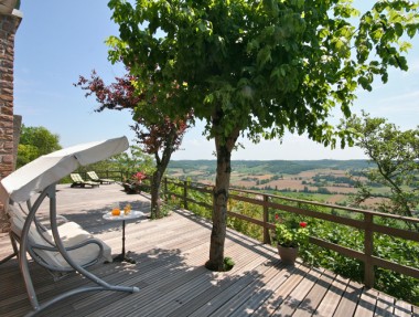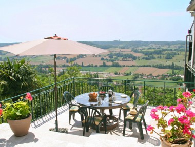 The Eyrie, highest residence in the medieval hill-top town of Penne d'Agenais on the Lot river. It has spectacular southerly views stretching from Tournon in the east to Villeneuve in the west. There is a heated pool which is surrounded by delightful terraced gardens offering complete privacy despite being only 5 minutes walk to the town centre. The house is light, sunny and stylishly furnished, with a large open plan sitting room dining room and conservatory. 2 of the 3 bedrooms have immediate access onto the sunny terraces. There is a BBQ and a playroom with table tennis, satellite TV, DVD and a wifi dongle. There is a well equipped galley kitchen. A few minutes stroll and you are in the heart of Penne with its many bars and restaurants. 5 mins by car to Port de Penne with more restaurants and bars, plus a good range of shops and services. Amble along the river, dip your toes, hire a boat or join the walkers along a branch of Le Chemin de Saint-Jacques-de-Compostelle which passes by the front gates.